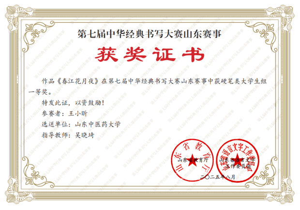 近日,由山东省教育厅、山东省语言文字工作委员会主办,山东教育电视台承办的2025年山东省中华经典诵写讲大赛比赛结果公布。在书写大赛中,我校王小昕的硬笔作品《春江花月夜》荣获硬笔类大学生组一等奖,该作品同时被省赛组委会推荐晋级全国总决赛,其指导教师吴晓琦获优秀指导教师奖;翟羽佳的《岳阳楼记》、许游祺的《诗词三首》荣获硬笔类大学生组三等奖;刘俊男的毛笔作品《墨池记》荣获毛笔类大学生组三等奖,刘怡彤的《伤寒论序句》荣获毛笔类大学生组优秀奖;教师海奇的毛笔作品《<黄帝内经>节录》荣获毛笔类教师组优秀奖。在诵读大赛中,GAN TUNG ZEN(中文名:颜松峻)的作品《诵读扁蔡经典,弘扬中医文化》荣获留学生组二等奖。