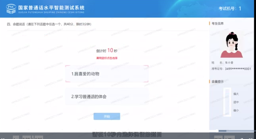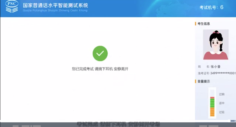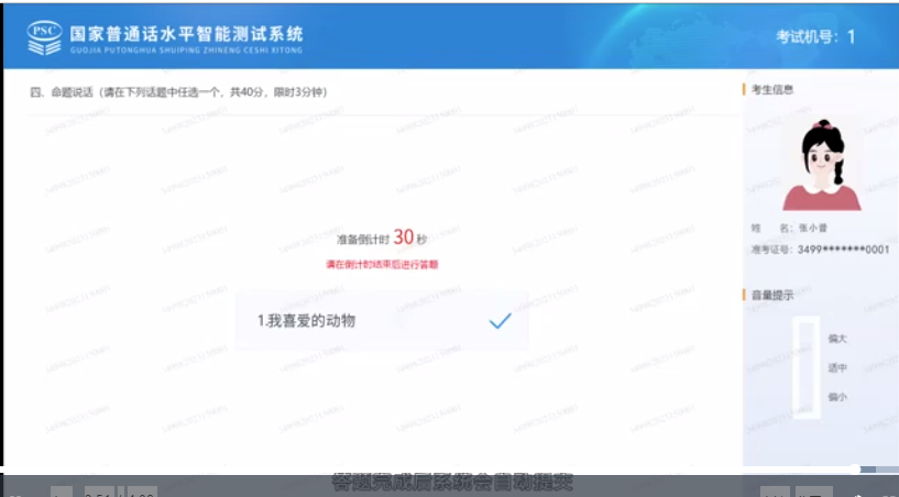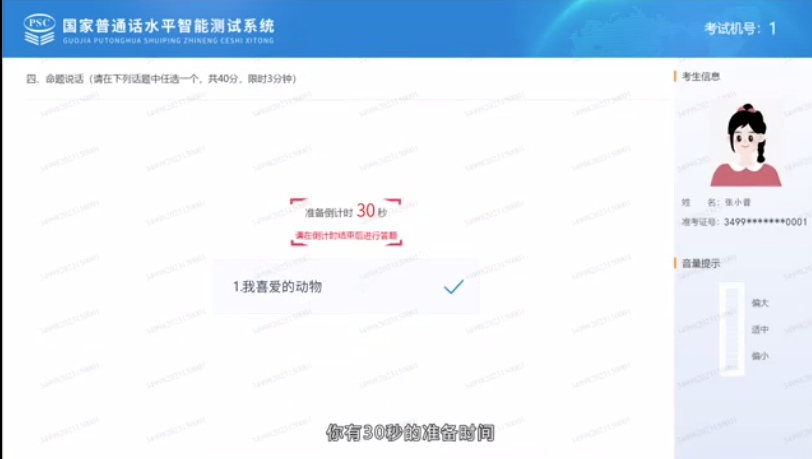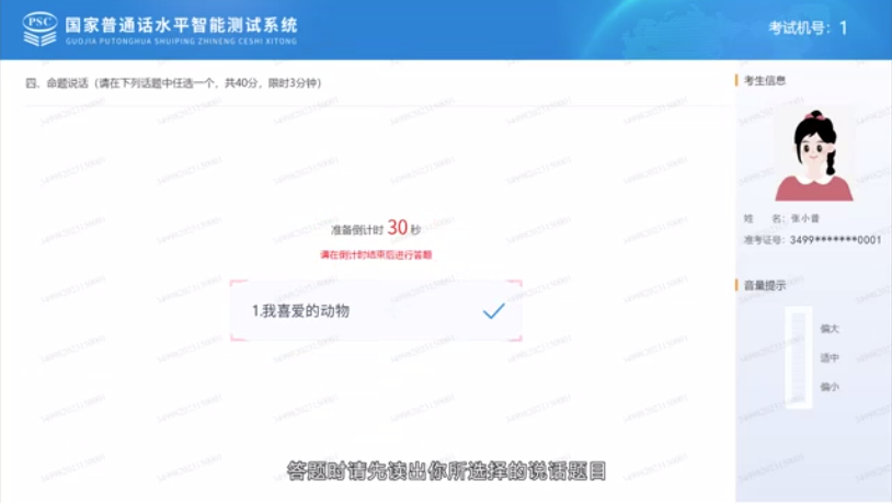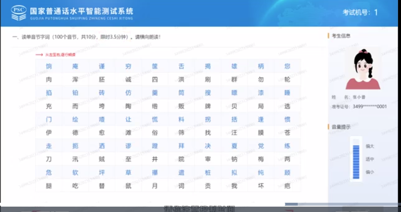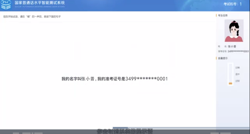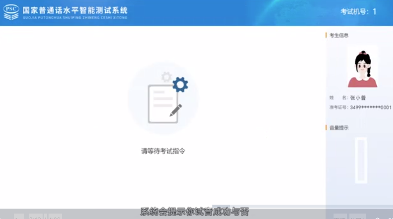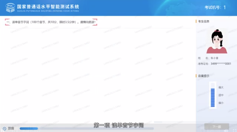 根据指令开始试音,请大声读出个人信息并控制好音量大小,音量在适中的位置上